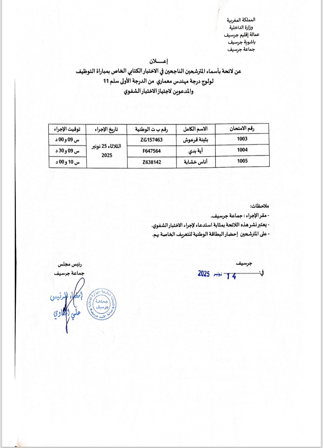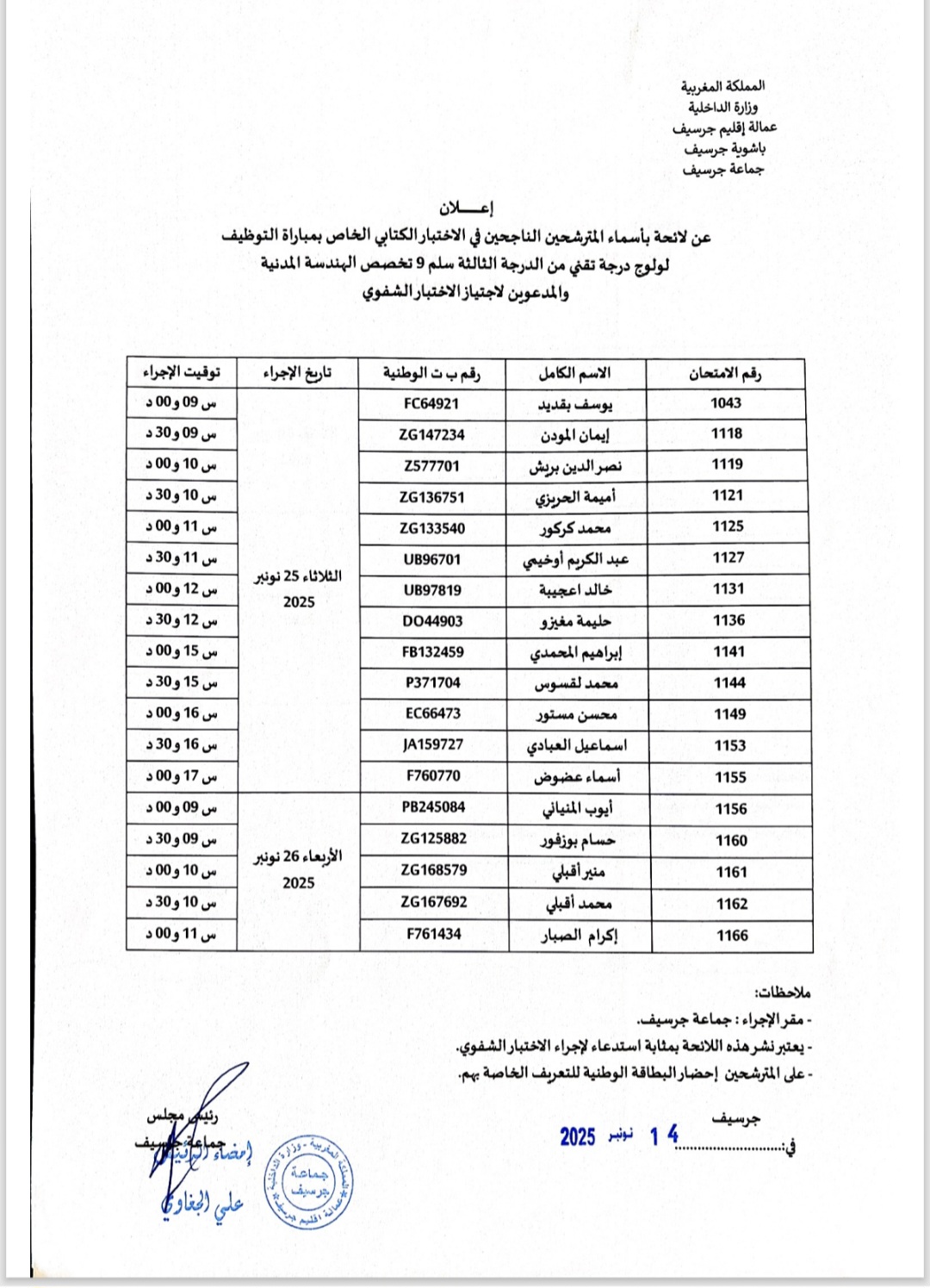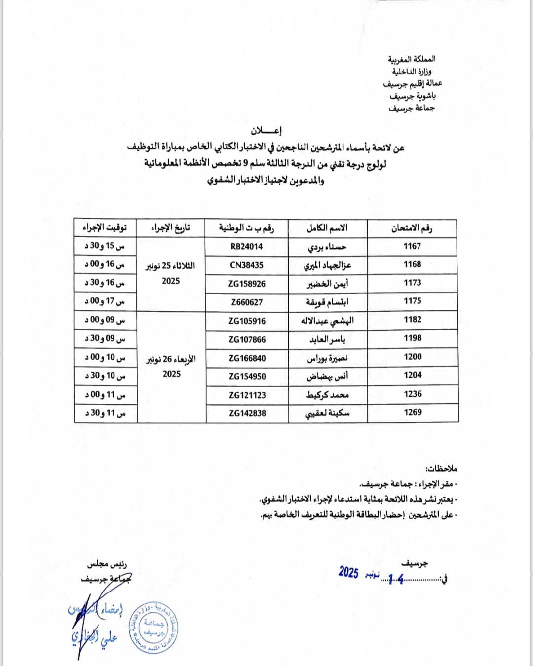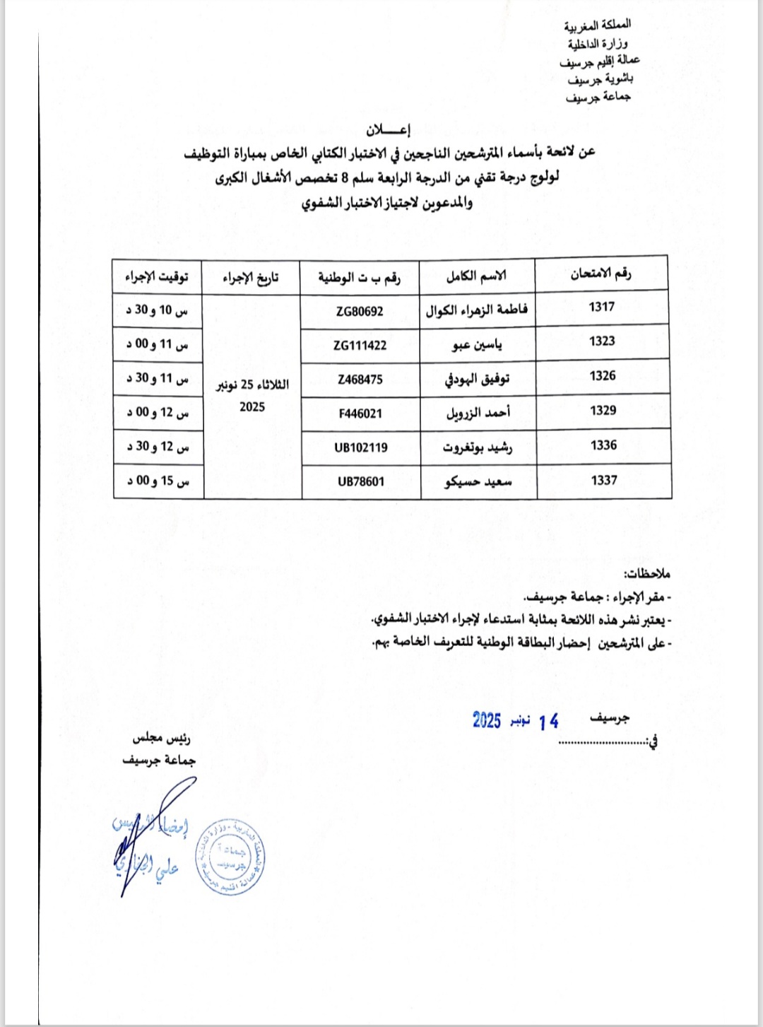 لائحة أسماء المترشحين الناجحين في الإختبار الكتابي في مباراة التوظيف بجماعة جرسيف والمدعوون لإجتياز الإختبار الشفوي: