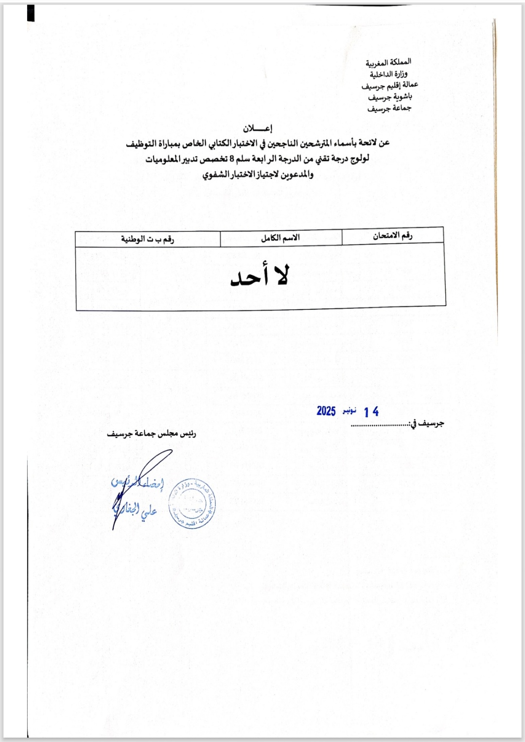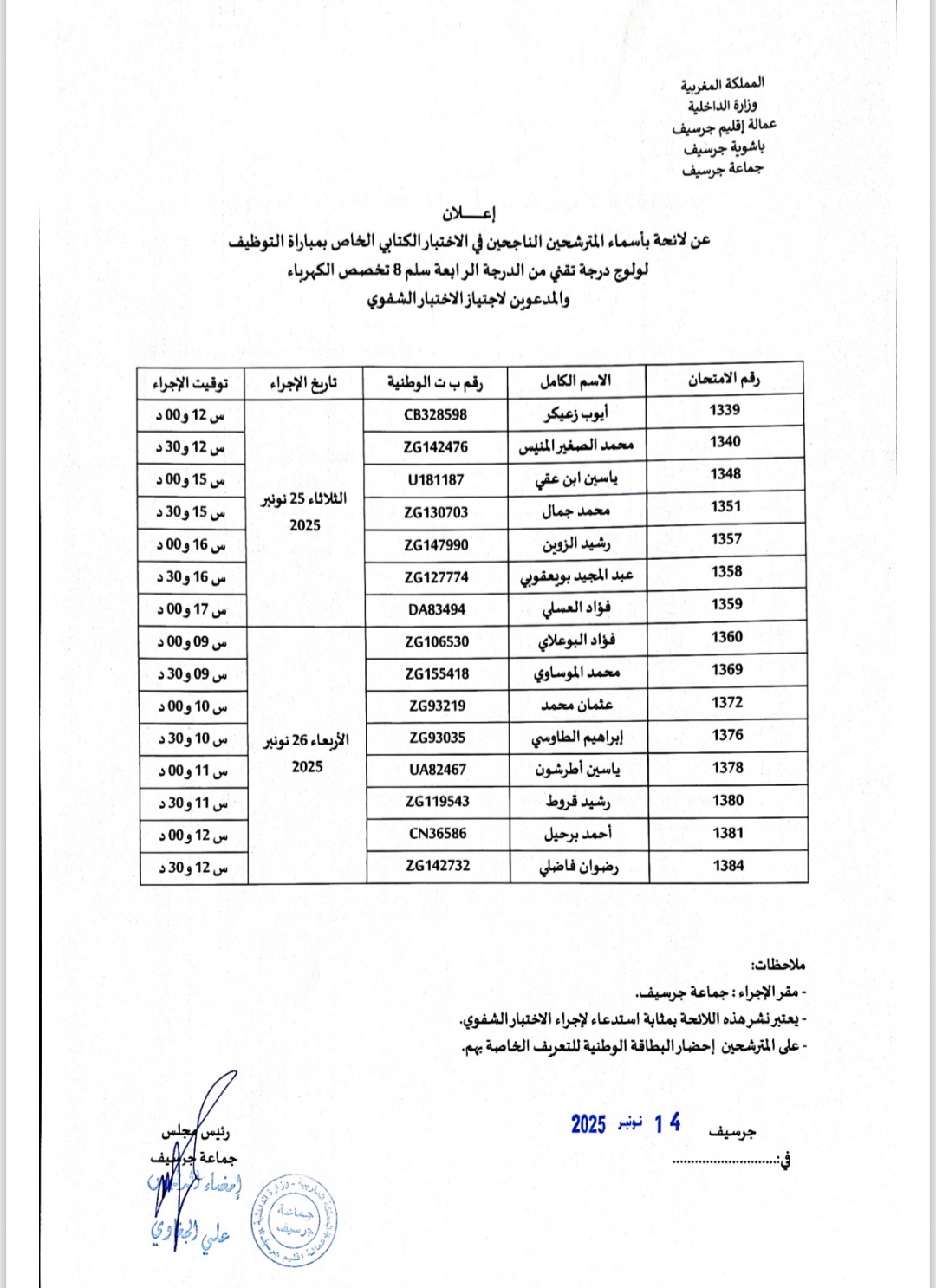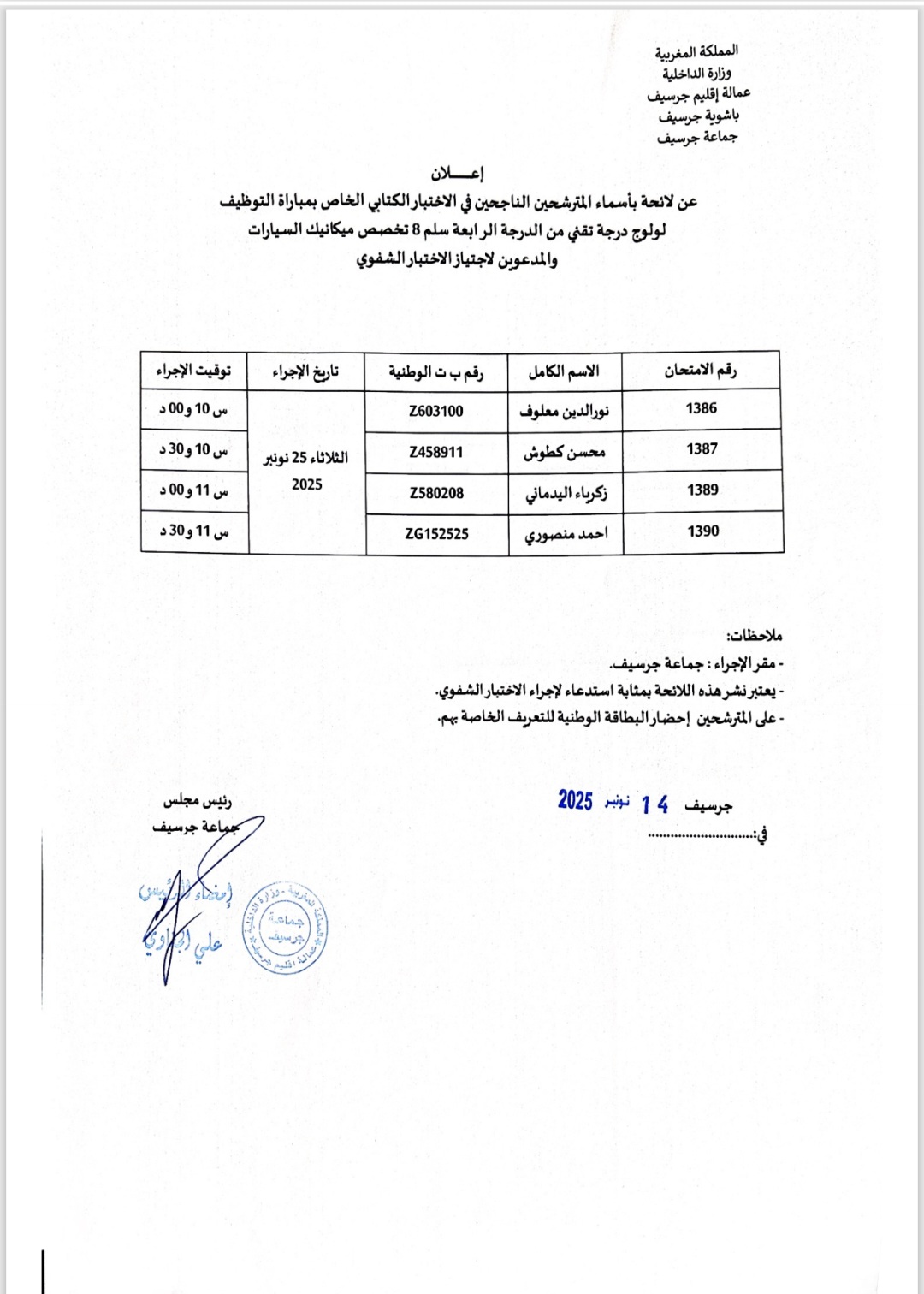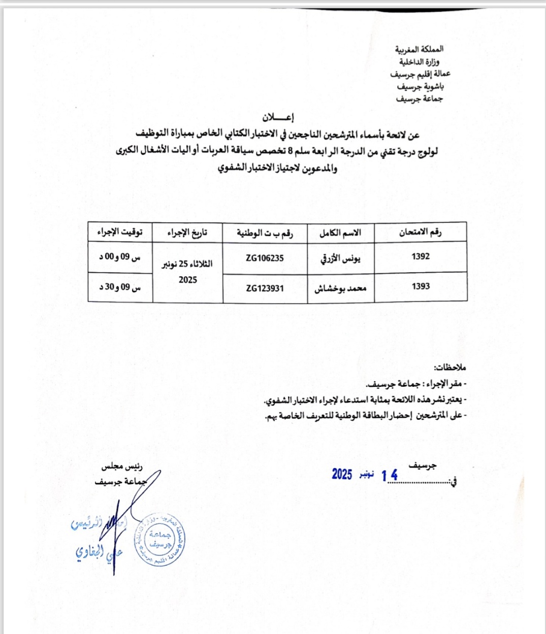 لائحة أسماء المترشحين الناجحين في الإختبار الكتابي في مباراة التوظيف بجماعة جرسيف والمدعوون لإجتياز الإختبار الشفوي: