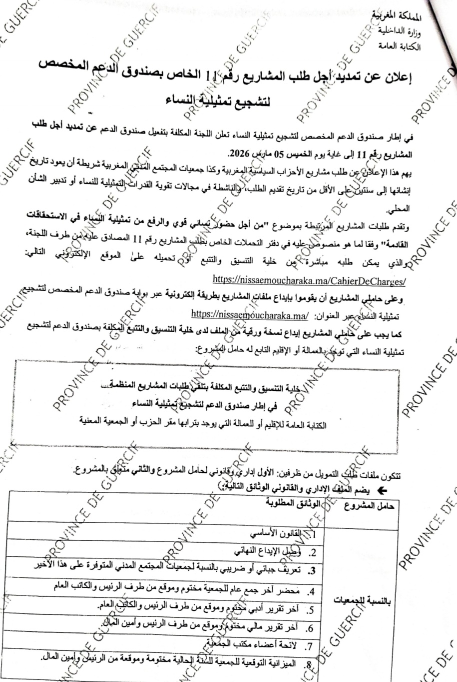 أعلنت وزارة الداخلية، عن تمديد أجل إيداع طلبات المشاريع رقم 11، في إطار صندوق الدعم المخصص لتشجيع تمثيلية النساء، وذلك إلى غاية يوم الخميس 05 مارس 2026، وفق ما حددته اللجنة المكلفة بتدبير هذا الصندوق.